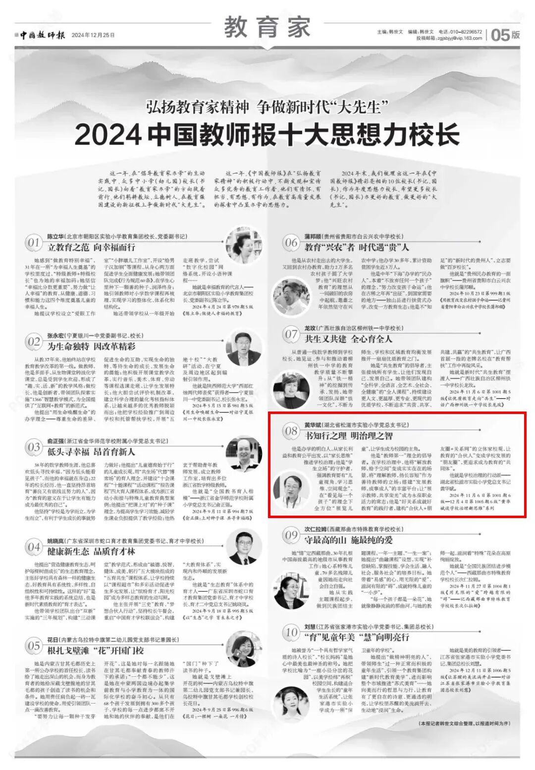 松滋市实验小学党总支书记黄华斌荣获“2024中国教师报‘十大思想力校长’”,系湖北唯一。