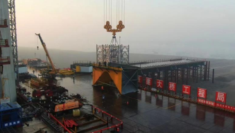 为确保首块钢横梁系板顺利吊装,项目团队精心组织,周密部署,科学制定吊装方案,对现场施工人员进行详细的安全、质量、技术交底,克服冬季高空施工不利因素。系板前期通过水路运输进场,受船舶装载条件限制,进场后需要水平旋转90度实现吊点转换,通过R4300-200塔吊与130吨履带吊的协同配合,最终调整至预定吊装姿态。