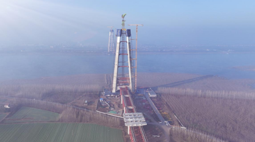 江汉风报道:1月5日,由湖北交投投资、中交二公院设计、西安方舟监理、中国铁建大桥局承建的世界最大跨度公路斜拉桥——观音寺长江大桥北岸主塔首块钢横梁系板顺利吊装到位,标志着主塔超高空施工取得重大进展,向着262米封顶目标迈出坚实一步。