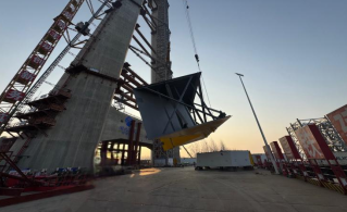 本次吊装的钢横梁系板作为连接左右幅塔柱的关键构件,高约7.8米,长约13.5米,宽约5.9米,自重约34.7吨,吊装高度为188.8米,相当于将35辆小汽车提升约60层楼的高度。整体外观色彩为鲜艳的黄色,在提升主塔识别度的同时,也与荆楚文化中,楚人崇凤的习俗高度契合,大桥建成后将成为荆楚大地一座崭新的文化地标。