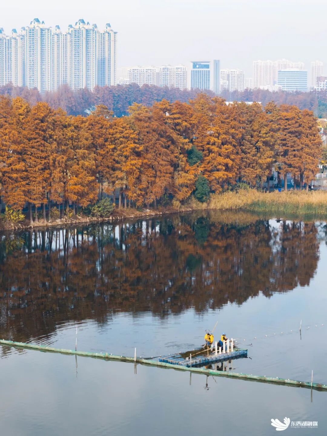 记者在东大湖看到,湖面正有工作人员对湖面的落叶以及水草进行清理,湖中还有蓝色的生态围格用于分区治理。据了解,生态围格可以有效抵抗风浪对湖泊的扰动,阻隔外源污染,提高水质改善效率,还能给水生植物提供更好的存活空间,从而达到长期净化水质的作用。