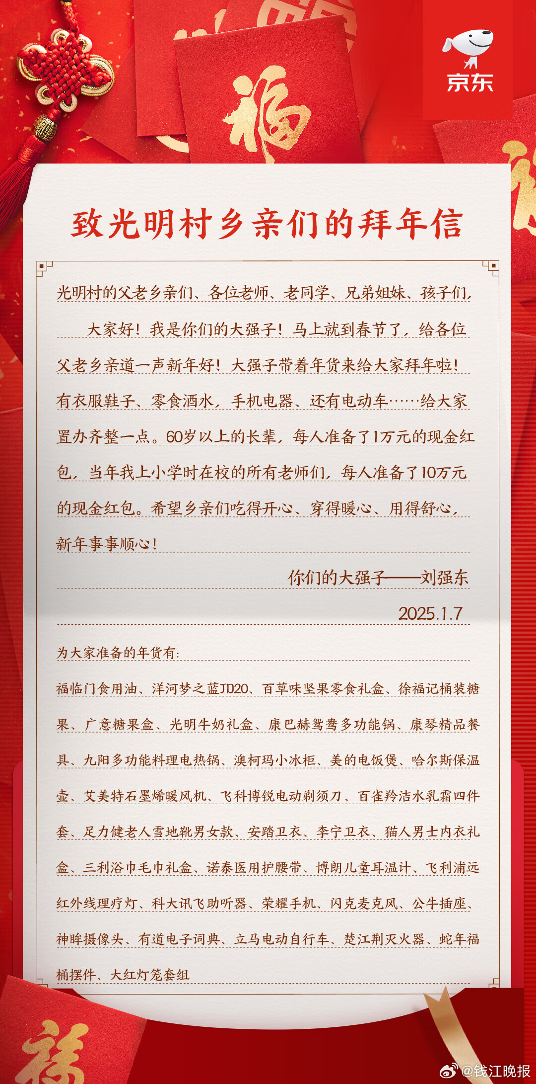 刘强东在《致光明村乡亲们的拜年信》中写道:“大家好!我是你们的大强子!马上就到春节了,给各位父老乡亲道一声新年好!”