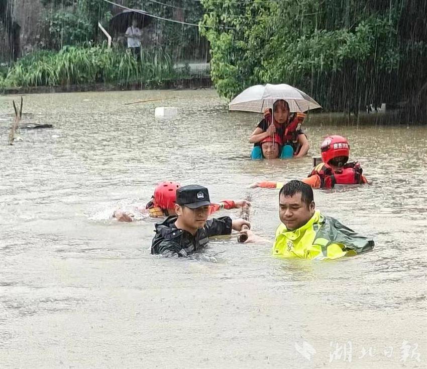 2024年6月,咸宁市公安局咸安分局民警涉水转移被困群众。(通讯员 朱静思 摄)