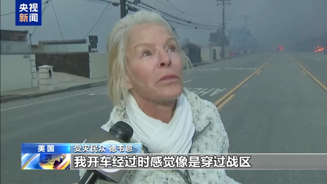 央视记者 刘骁骞:我身后天空弥漫的浓烟就是正在蔓延的帕利塞德山火。我们刚刚前往圣塔莫尼卡市采访,刚到没多久,我们的手机上就收到了大量洛杉矶县政府发出的强制撤离的短信,要求所有居民必须立刻撤离,因为山火正在向居民区蔓延。在一个街角,我们看见警察拉起了一层又一层的警戒线,因为地势比较高的居民区已经有火势,我看见很多居民想要回家取东西,但是都被阻拦了。