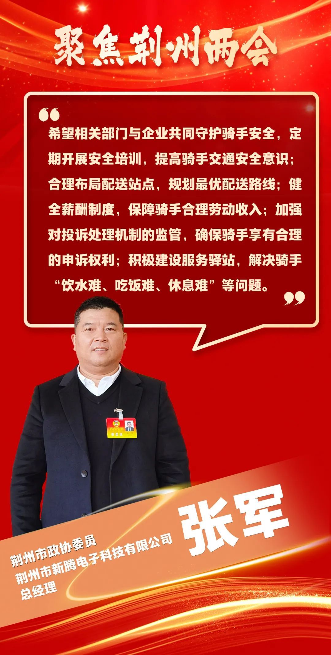 这几年城市发展步伐加快,快递行业也实现了蓬勃发展,快递从业人员增多。今年我带来的提案,就是关注快递骑手安全问题的建言。希望相关部门与企业共同守护骑手安全,定期开展安全培训,提高骑手交通安全意识;合理布局配送站点,规划最优配送路线;健全薪酬制度,保障骑手合理劳动收入;加强对投诉处理机制的监管,确保骑手享有合理的申诉权利;积极建设服务驿站,解决骑手“饮水难、吃饭难、休息难”等问题。