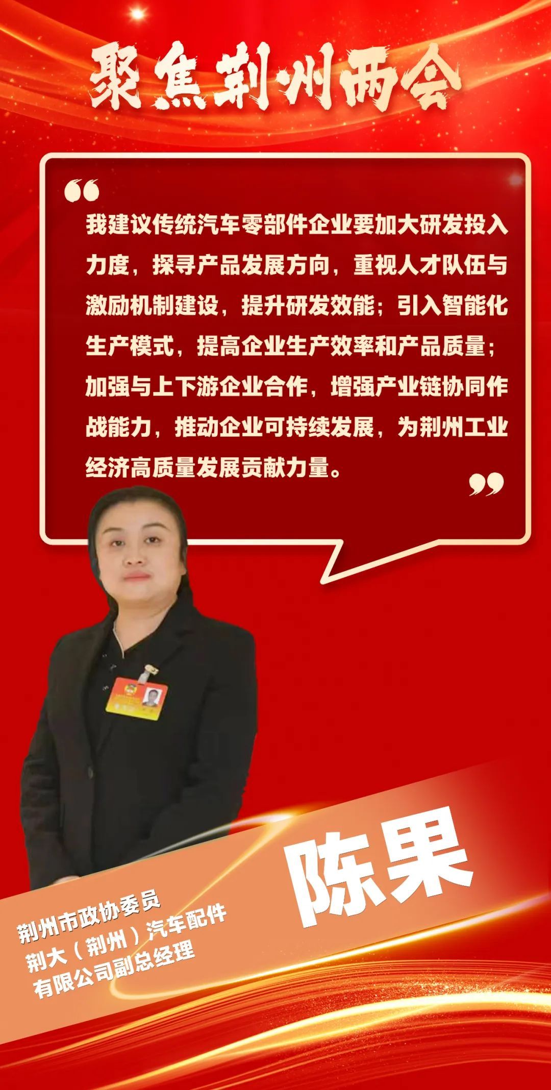 我建议传统汽车零部件企业要加大研发投入力度,探寻产品发展方向,重视人才队伍与激励机制建设,提升研发效能;引入智能化生产模式,提高企业生产效率和产品质量;加强与上下游企业合作,增强产业链协同作战能力,推动企业可持续发展,为荆州工业经济高质量发展贡献力量。