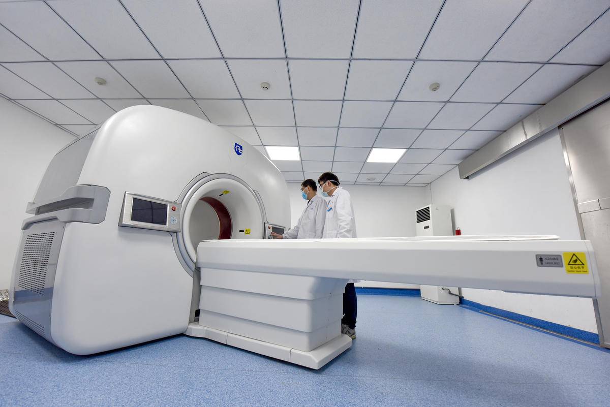 鄂州市中心医院核医学科操作人员对全球首款临床全数字PET-CT进行调试。(视界网 叶雁翅 摄)
