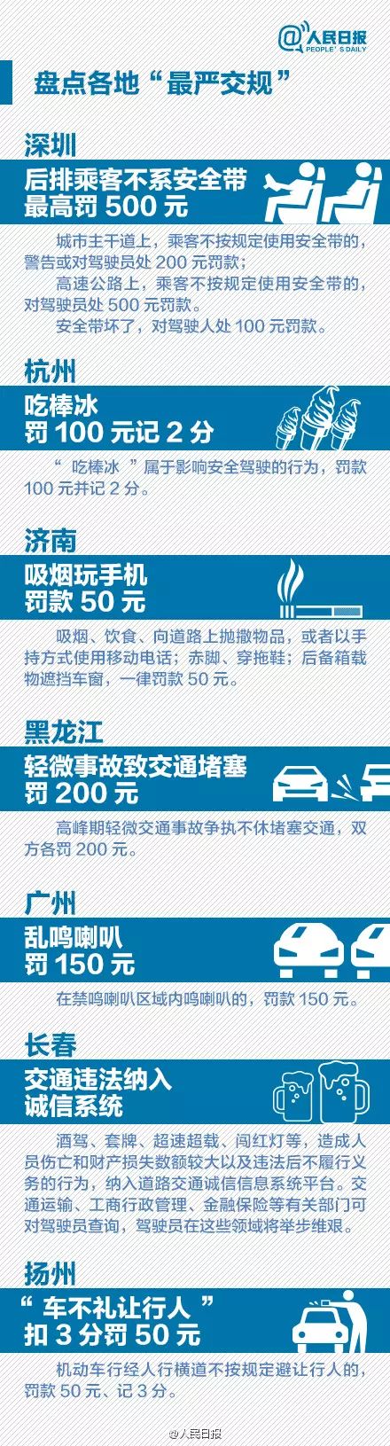 最新交通违法违章处罚大全在这里!别怪我没提醒你... 2017-01-06 14:42 人民日报 0 深圳对后排不系安全带行为开罚,最高罚500元;在杭州,一司机因为吃棒冰开车被罚100元、记2分,同样引发热议。国家规定的交通违法违章行为都包括哪些?各地有哪些严格规定?酒后驾驶怎么罚…… 关于交通违法违章记分、罚款的规定都在这↓↓↓ 转给开车族!