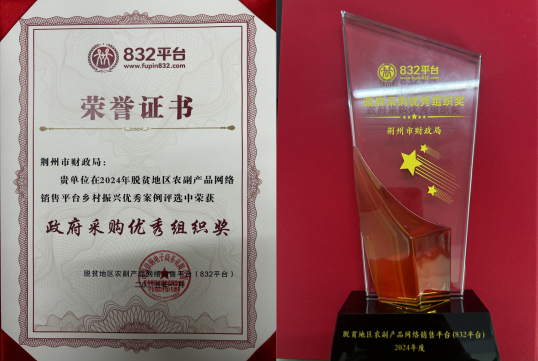 江汉风报道:腊月里,年味浓。近日,“832平台”(即脱贫地区农副产品网络销售平台)组织开展的2025年脱贫地区“土特产”年货大集活动在北京举行,该平台表彰了2024年度对乡村振兴工作有特别贡献的集体和个人,其中荆州市财政局荣获“政府采购优秀组织奖”。