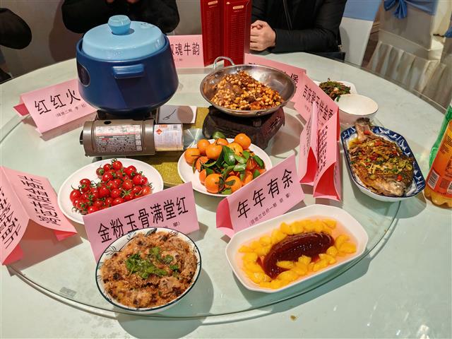 年年有余、金粉玉骨满堂红、清蒸五福洈水大白刁......,一道道寓意满满的菜摆上桌,每一道菜都是凤鸣社区的居民精心准备的,满含对彼此的祝福,吉祥又喜庆。