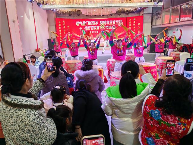 社区还组织居民准备了精彩的文艺表演,鼓舞、手帕舞、快板、古筝等各种节目轮番上演,大家看得乐呵呵。书法家们现场写春联、送福字,让大家把新春祝福带回家。