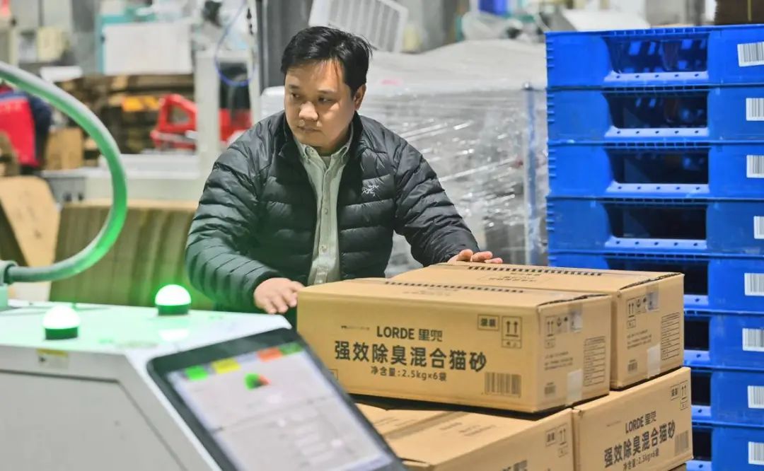 湖北爱宠的合伙人之一的负责人王健正在查看即将出口的猫砂产品。(湖北日报全媒记者 刘曙松 记者 肖敏 摄)