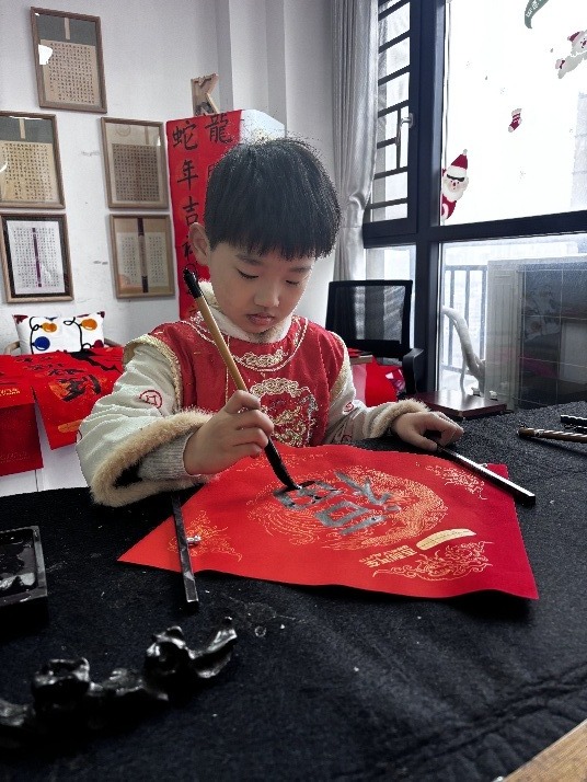谢慕霖小朋友写春联,祝大家新年快乐、万事如意。