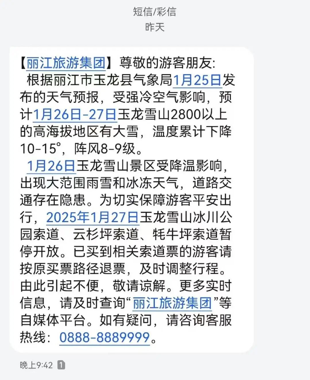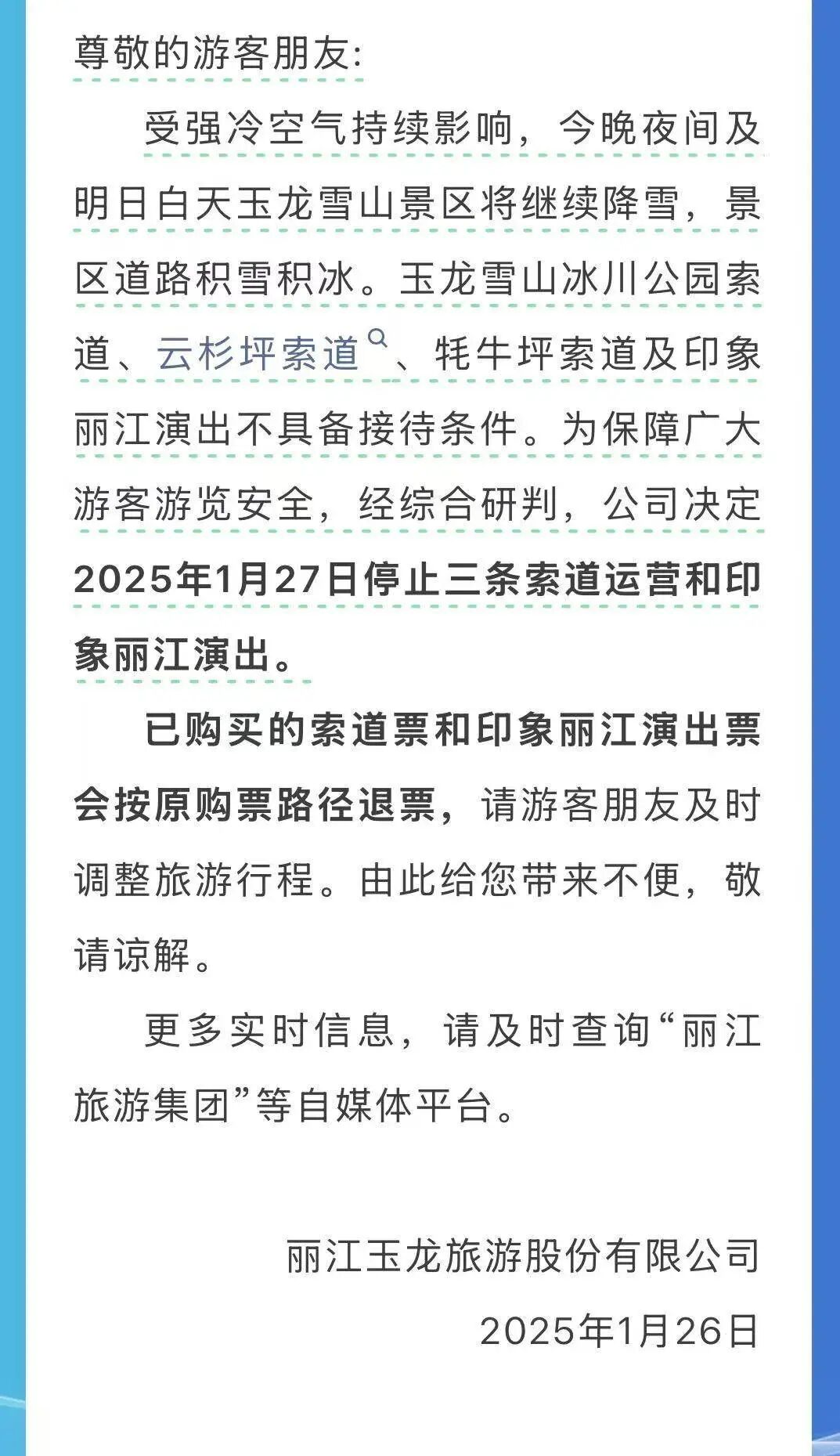 记者注意到,丽江旅游集团于1月26日晚23时许发布了《关于2025年1月27日玉龙雪山索道及印象丽江演出暂停接待通知》。