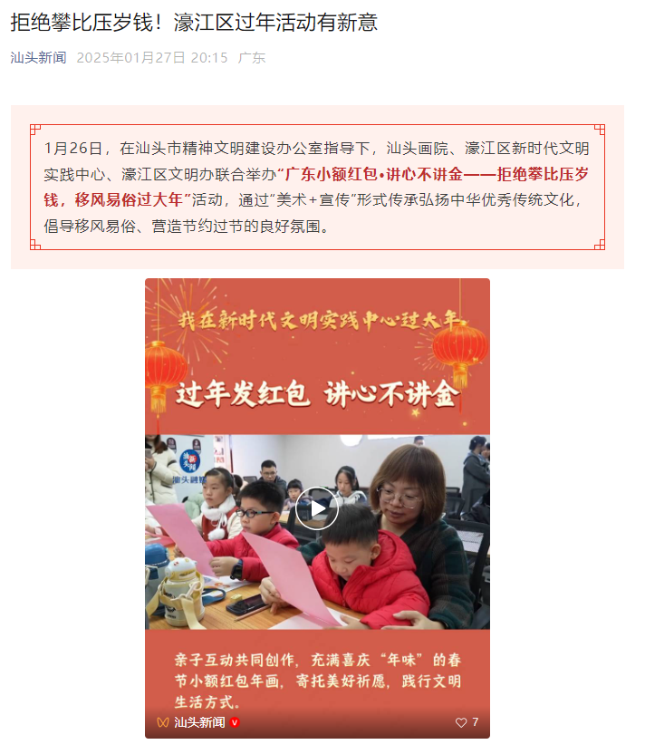 另据微信公众号“汕头新闻”消息,1月26日,在广东汕头市精神文明建设办公室指导下,汕头画院、濠江区新时代文明实践中心、濠江区文明办联合举办“广东小额红包·讲心不讲金——拒绝攀比压岁钱,移风易俗过大年”活动,通过“美术+宣传”形式传承弘扬中华优秀传统文化,倡导移风易俗、营造节约过节的良好氛围。