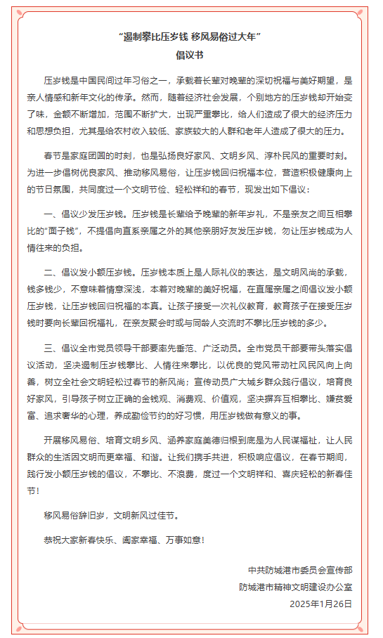 1月26日,广西防城港市委宣传部、市精神文明办发出倡议书称,为进一步倡树优良家风、推动移风易俗,让压岁钱回归祝福本位,营造积极健康向上的节日氛围,共同度过一个文明节俭、轻松祥和的春节,现倡议少发压岁钱。压岁钱是长辈给予晚辈的新年岁礼,不是亲友之间互相攀比的“面子钱”,不提倡向直系亲属之外的其他亲朋好友发压岁钱,勿让压岁钱成为人情往来的负担。