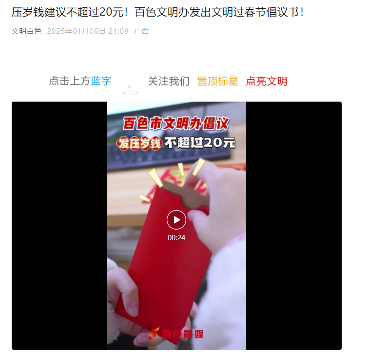 百色方面还表示,本着对晚辈的美好祝福,在直属亲属之间倡议发不超过20元的小额压岁钱,让压岁钱回归祝福的本真。全市党员干部要带头落实倡议活动,坚决遏制压岁钱攀比、人情往来攀比,以优良的党风带动社风民风向上向善。