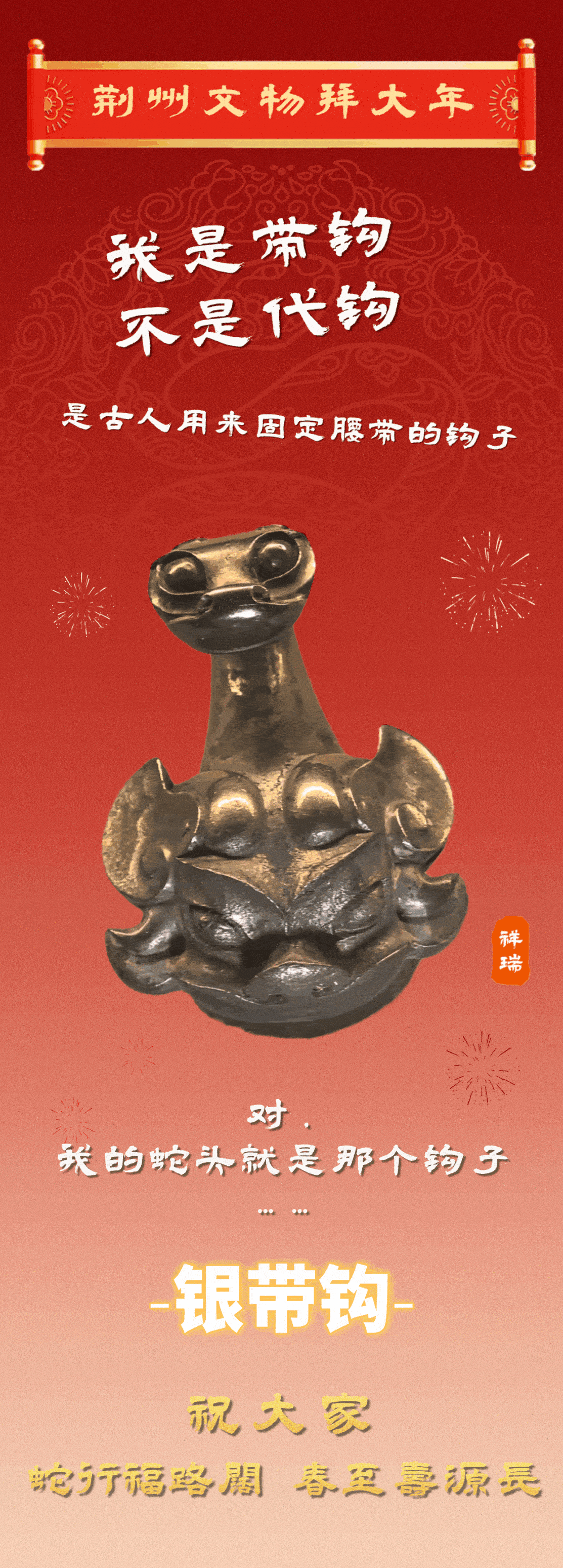 银带钩(战国天星观二号楚墓出土):钩首呈蛇头形,钩身为七条蟠蛇,其中六条以两条为一组呈对称排列,另一条居中只露蛇面。2025年是乙巳蛇年,荆州博物馆精选馆藏30多件以蛇为题材的文物,年代跨度从东周到明清,展览从图腾崇拜中的蛇、北方神灵玄武、十二生肖中的蛇等视角,阐释蛇年蛇生肖及古代蛇文化。