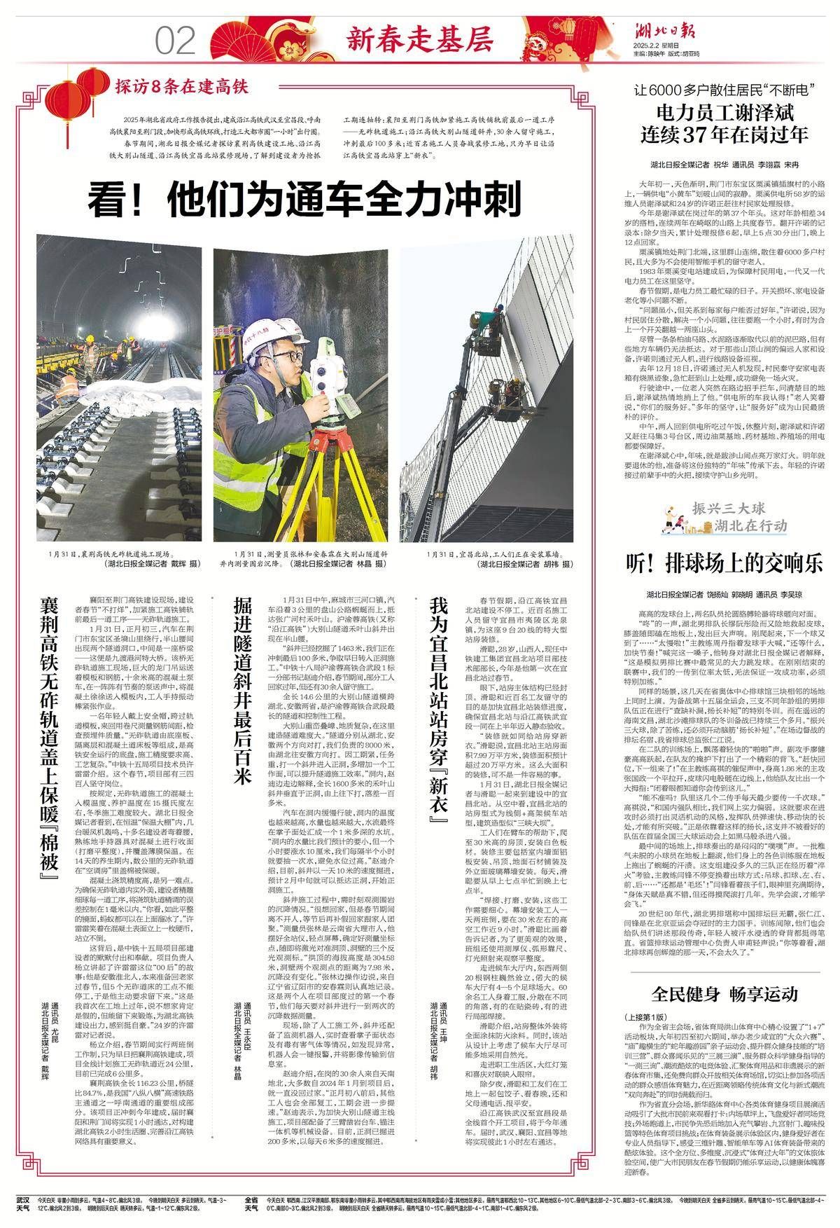 春节期间,湖北日报全媒记者探访襄荆高铁建设工地、沿江高铁大别山隧道、沿江高铁宜昌北站装修现场,了解到建设者为抢抓工期连轴转:襄阳至荆门高铁加紧施工高铁铺轨前最后一道工序——无砟轨道施工;沿江高铁大别山隧道斜井,30余人留守施工,冲刺最后100多米;近百名施工人员奋战装修工地,只为早日让沿江高铁宜昌北站穿上“新衣”。