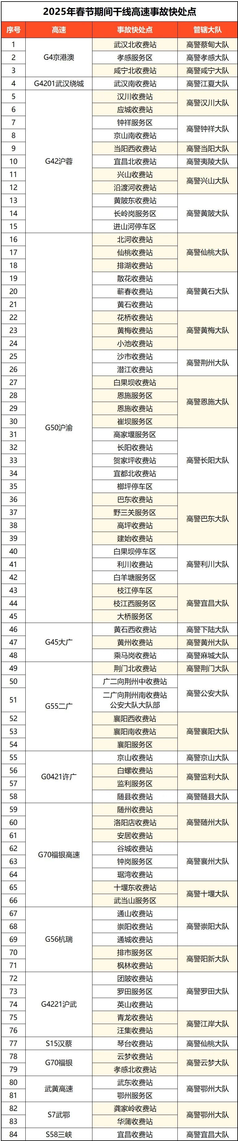 在省内干线高速通行期间,如遇轻微事故可就近前往以下84个省内干线高速事故快处点处理,切勿在高速公路上逗留。