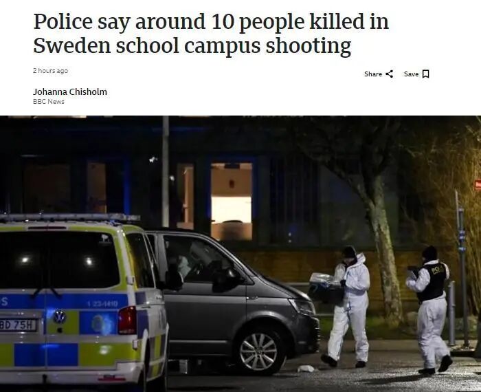 据英国广播公司(BBC)5日报道,瑞典警方称,当地时间4日,该国中部厄勒布鲁市一所教育中心发生枪击事件,造成10人死亡,其中包括1名嫌疑人。