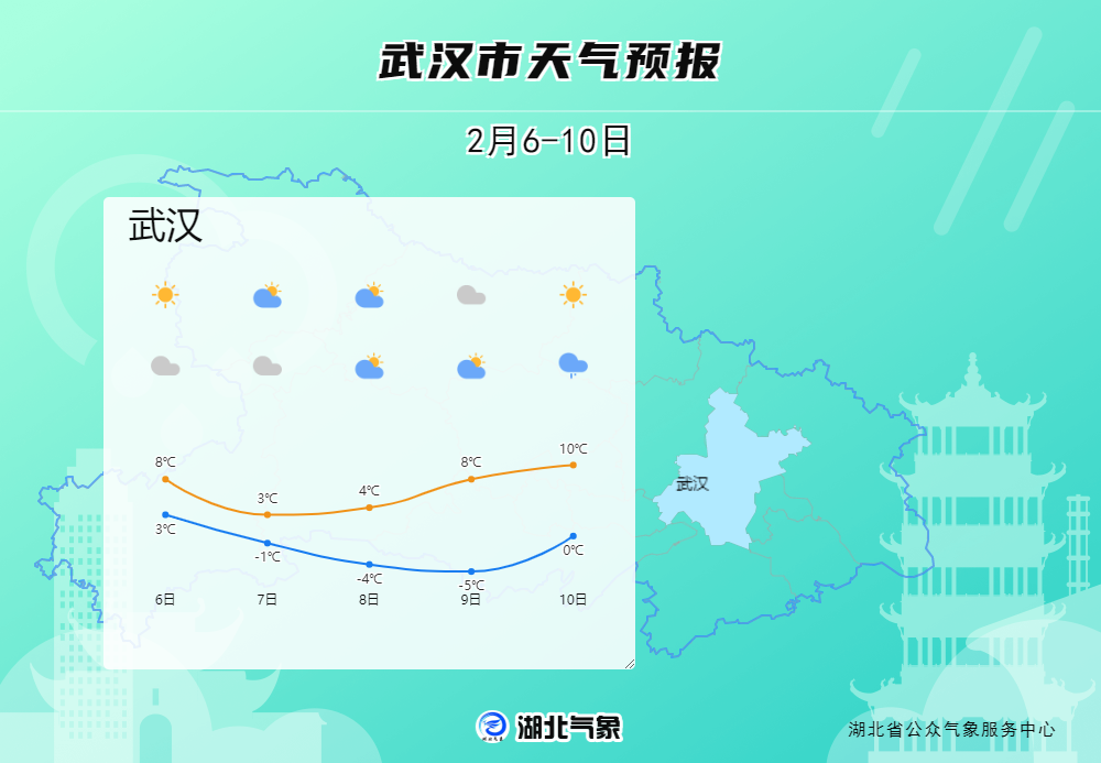预计8日武汉最高气温仅4℃,或将成为今冬以来最冷白天。8日最低温将降至-5℃,比5—6日最低温4℃,骤降近10℃。