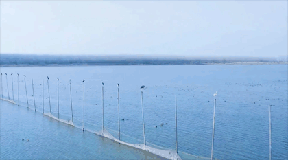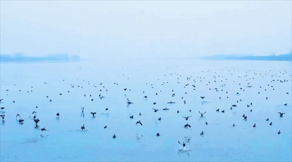 群鸟栖息在江面上,航拍无人机慢慢飞过去,部分鸟儿相继起飞,或在江面凌空盘旋飞翔,又或是加速朝江面俯冲,像一支训练有素的特技飞行表演队,姿势优美。长江故道滩涂水地相接、泥土湿润水草丰茂,大批候鸟在此停歇或繁殖,反映出这里的生态正持续向好。长江故道群鸟飞翔,正是一幅人与自然和谐共生的美好生态画卷。