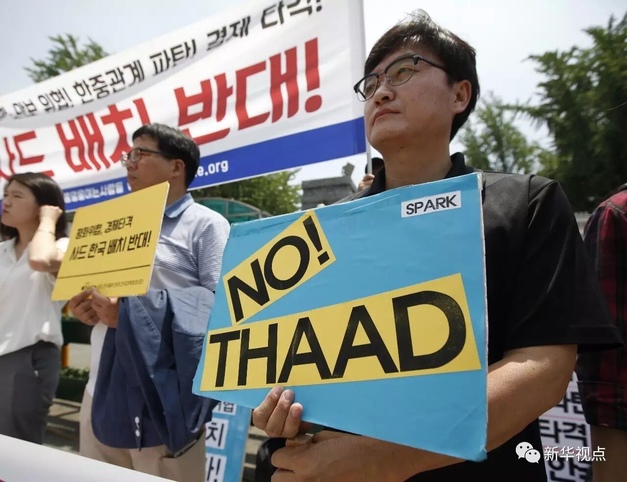 2016年7月8日,在位于首尔的韩国国防部门前,韩国市民团体高举标语反对韩美在韩部署“萨德”系统。