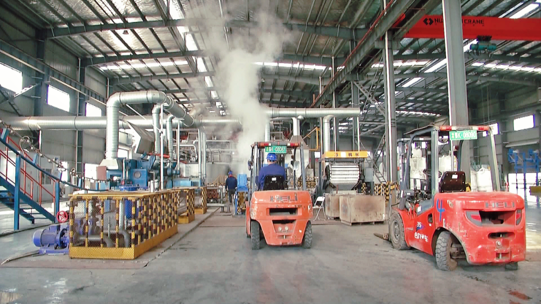 同样在孝昌县澴西工业园的湖北彤瑞新材料有限公司,各条生产线也火力全开,全力赶制订单。走进生产车间,全自动泡塑成型机、全自动泡塑发泡机、空压机、冷却塔等生产设备正有序运转,工人们在各自岗位上有条不紊地忙碌着。