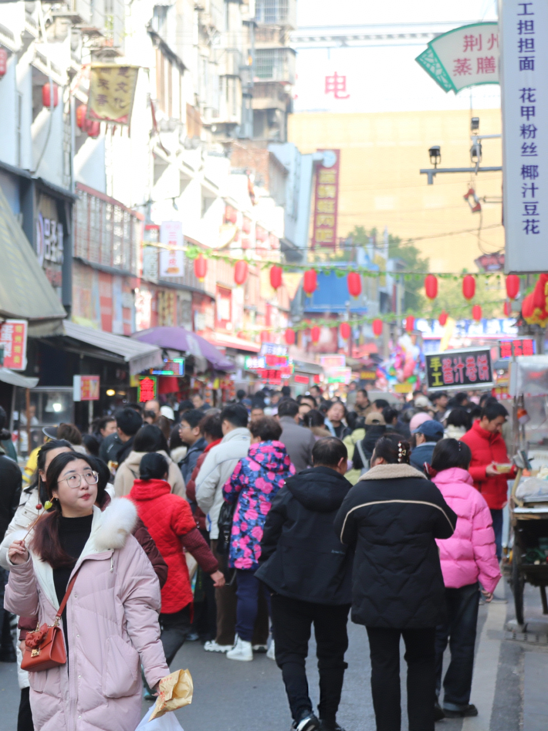 ▲在欢庆祥和的春节期间,沙市区的两大著名美食聚集地——大赛巷小吃街与黄家塘美食街,迎来了前所未有的热闹景象。(图源|荆州市文旅局)