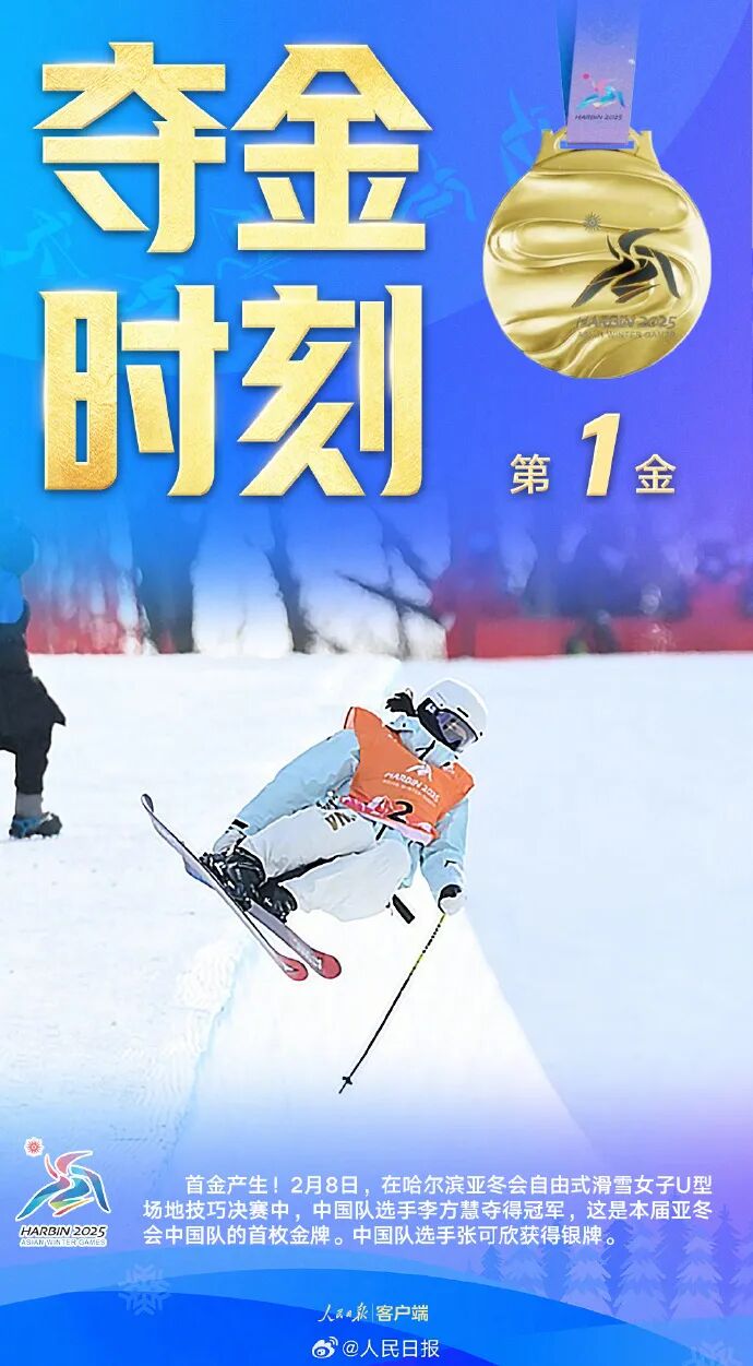 2月8日,在亚冬会自由式滑雪女子U型场地技巧决赛中,山东选手李方慧以95.25分的成绩夺冠,夺得中国代表团本届赛事首枚金牌。