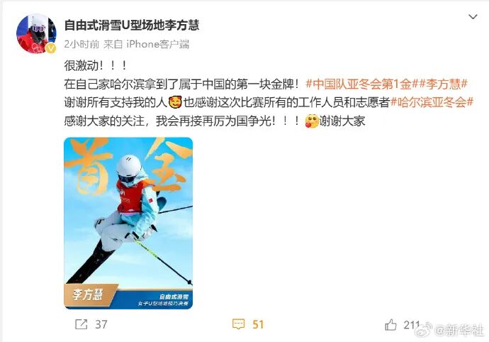 同日,高亭宇亚冬会速度滑冰男子100米夺金,赛后发博:能在家乡拿金牌非常激动,我在这块冰面上滑过无数圈,但这次体会到场馆设施及冰面翻天覆地的变化,现在已经是世界级崭新的场馆,国家越来越好,家乡越来越好,我也会继续努力,继续挑战自我,干就完了。