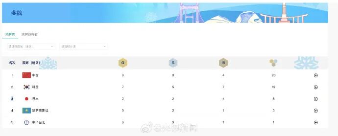 据央视新闻,目前,亚冬会官网奖牌榜显示,中国队以8金、8银、4铜的成绩,位列金牌榜、奖牌榜首位。
