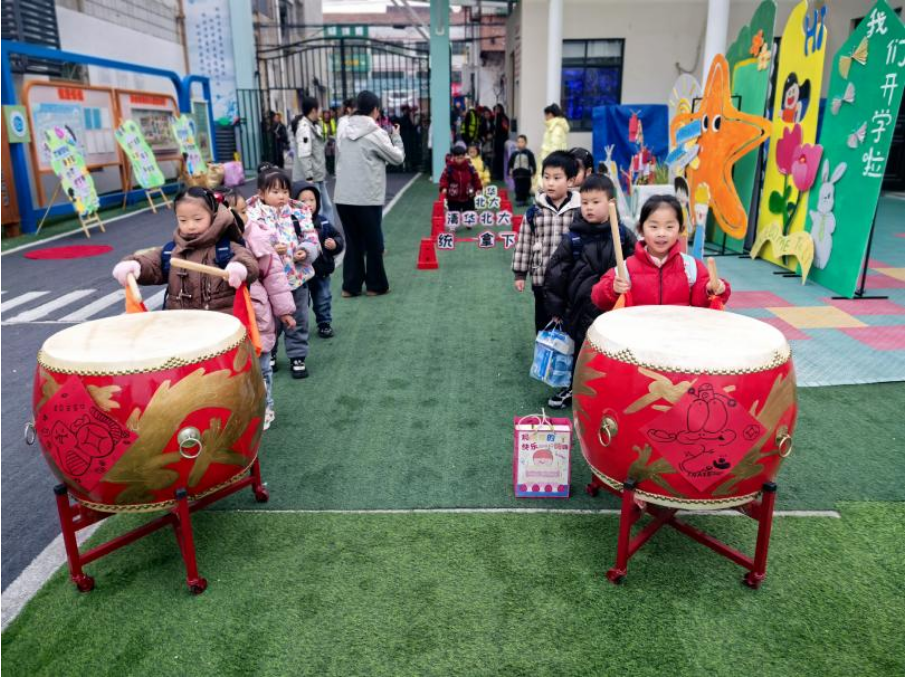 联合街道中心幼儿园精心准备“成长三部曲”,孩子们在老师的带领下跨过寓意成长的“进步栏”,敲响象征一鼓作气的“迎新鼓”,合力抛起“好运球”,孩子们在欢声笑语中开启新学期。