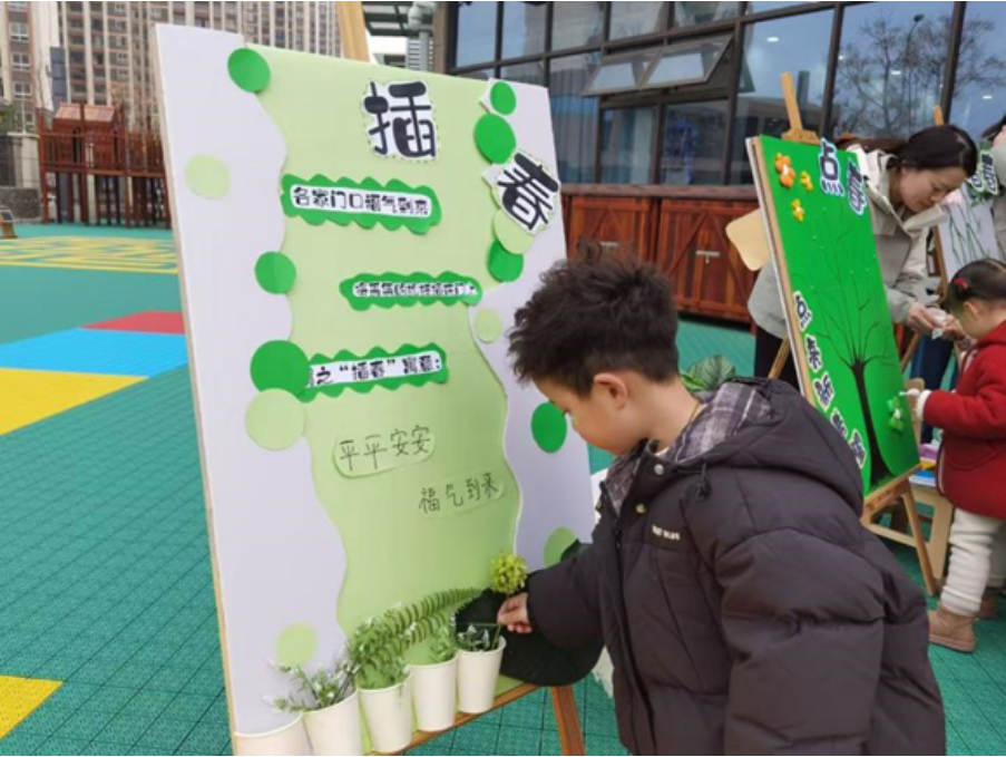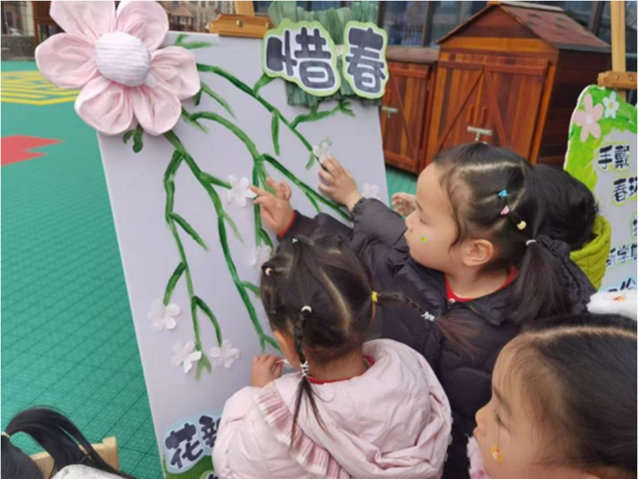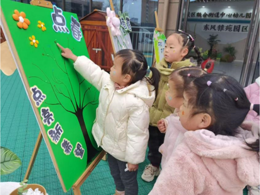 联合街道中心幼儿园东风雅苑园区精心准备了“插春”“点春”“惜春”小游戏,孩子们将代表春的小树枝插入容器中,用小手指在树枝上“画”上小树叶、小花朵。