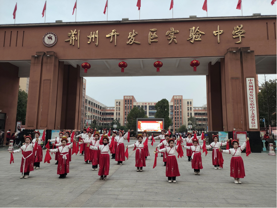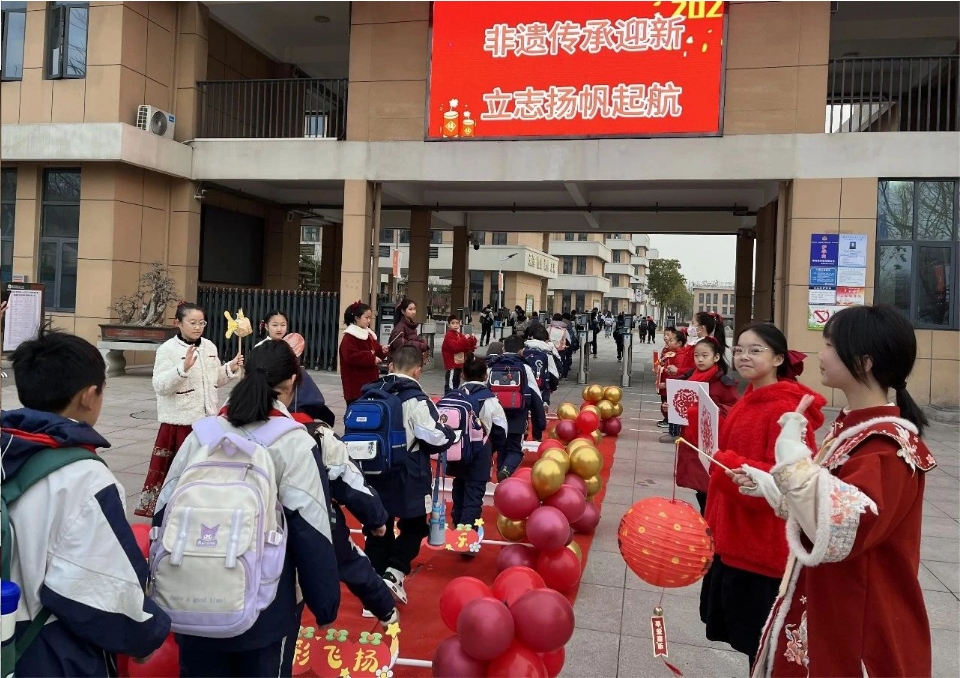 开学第一天,经开区第一小学的大队委们身着新中式年服,手持纸翻花蛇、鱼灯、拓印福字、风筝、漆扇等具有中华传统文化符号的非遗物品,在校门口迎接同学们的到来,为所有同学献出开学的第一份温暖。