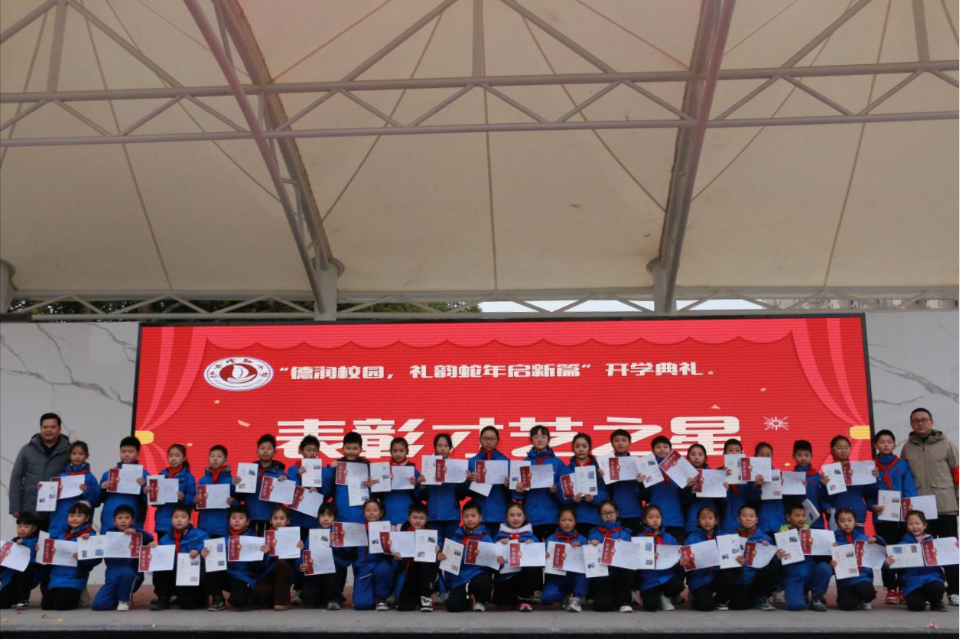 今天上午,沙市实验小学举行开学典礼,老师为同学们送上新学期寄语,并为足球队队员、才艺之星颁发奖状,拉开蛇年新学期的序幕。