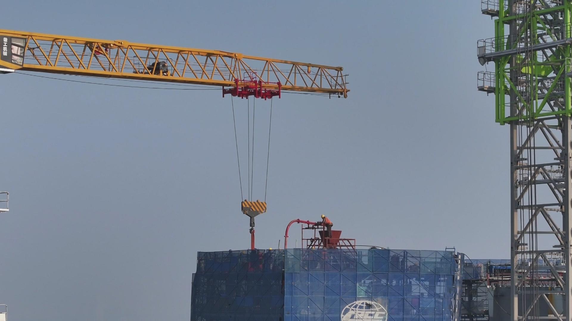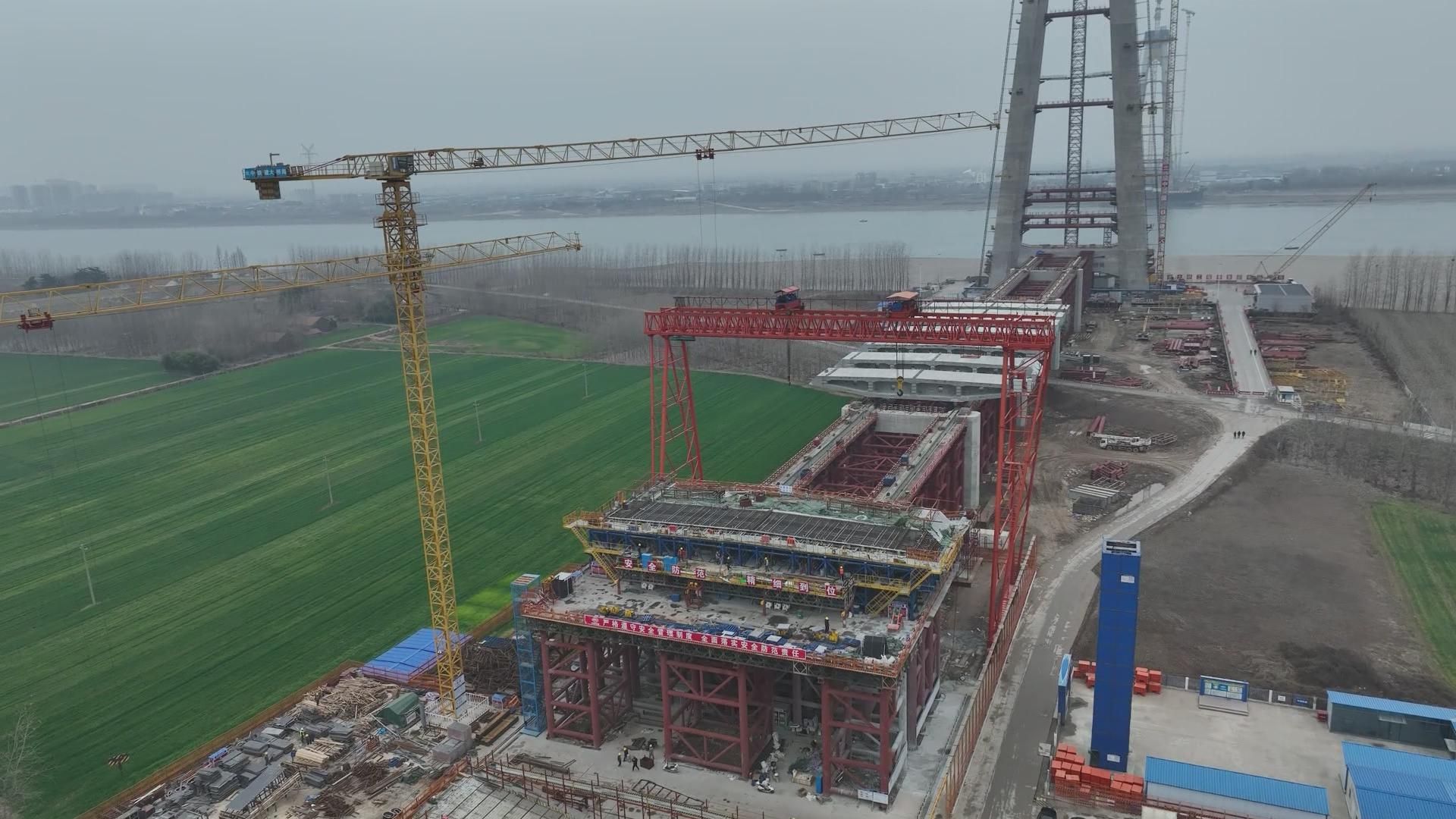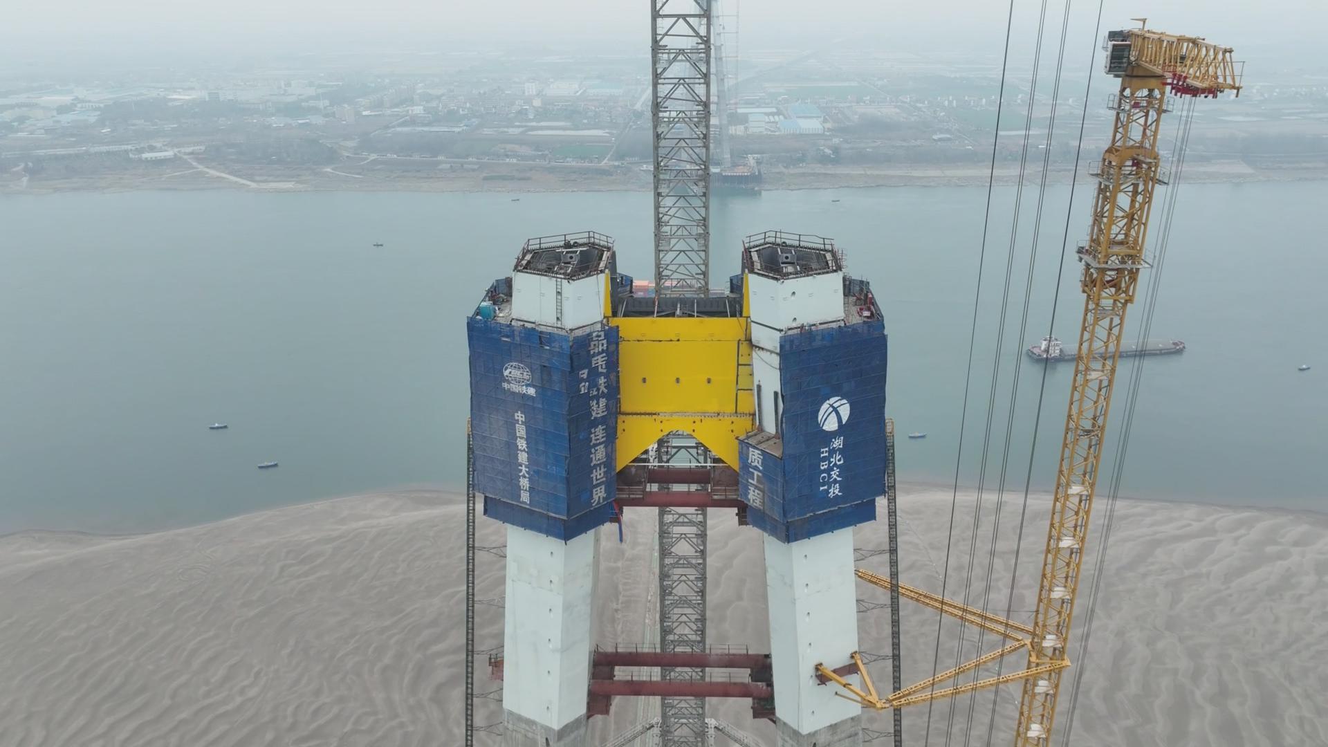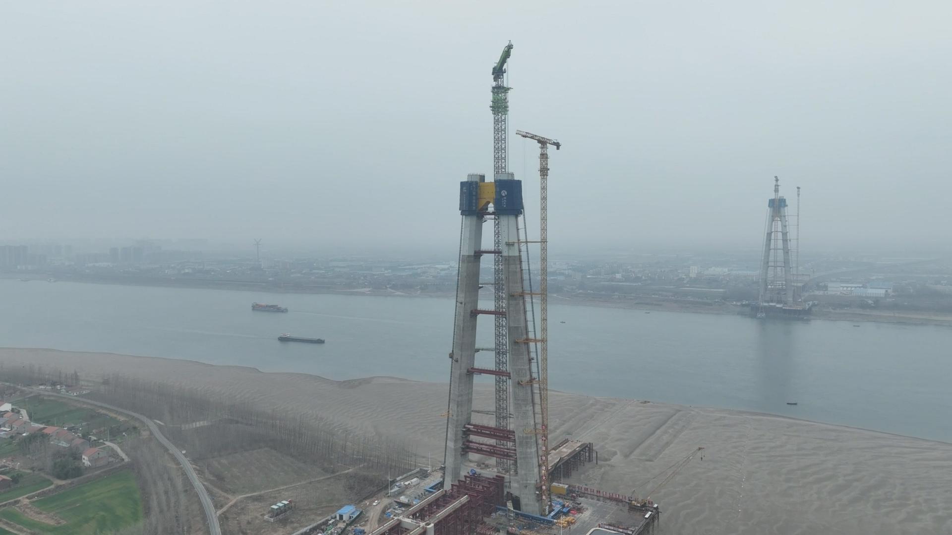 在江陵县同心村江边,200多米高的主塔直入云端,建设者在塔吊等设备配合下,加紧进行上部钢壳-混凝土塔柱施工,让主塔节节拔高。