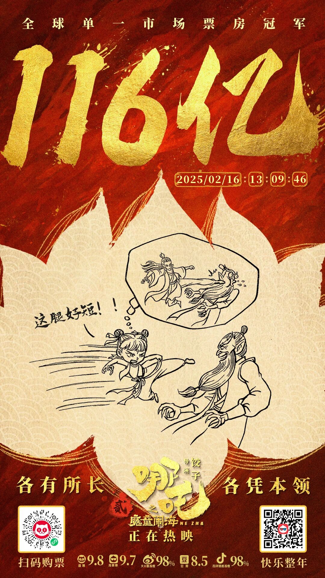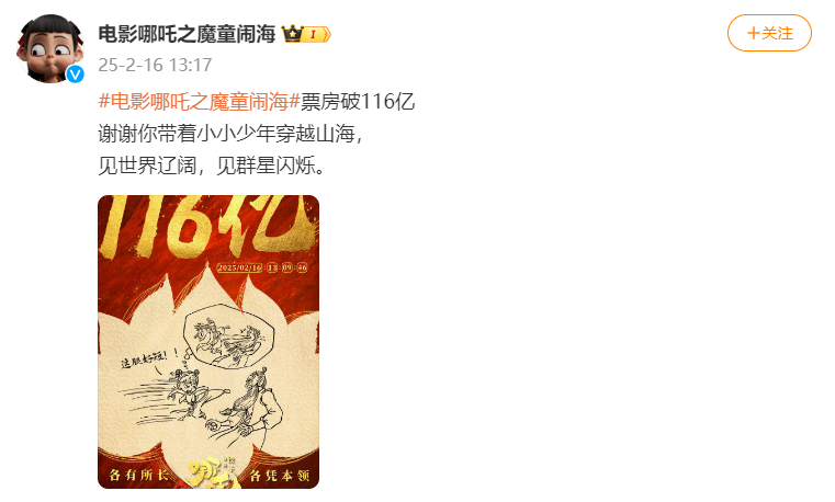 今天13时17分,电影《哪吒之魔童闹海》官方微博发布海报,并配文称“票房破116亿, 谢谢你带着小小少年穿越山海,见世界辽阔,见群星闪烁。”