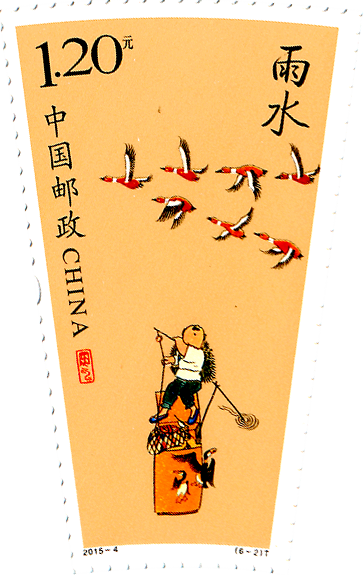 江汉风报道:二十四节气特种邮票的第二枚是“雨水” 。2025年雨水节气2月18日。著名画家刘金贵釆用传统的中国画表现手法绘制了这枚邮票。用笔十分老练简约,廖廖数笔就勾勒出人物的风貌和物候的时间特征,北上回归的鸿雁显示了冬去春来。用色也十分简约,只是在古色古香的黄底色上用黑色描绘出水上捕鱼的主题人物和捕魚船以及鱼鹰、鱼网和捕获的鱼。用深黄色给捕鱼船和鸿雁羽毛染色,整张邮票大胆地釆用写意手法,表现了农村广阔天地、水天一色的意境。整枚邮票主题突出、背景简略。展现出好雨知时节,春风携春水,润物无声天地间。春雨萌新生,河冰消融、鱼儿畅游,呈现万物复苏,生生不息的吉象。