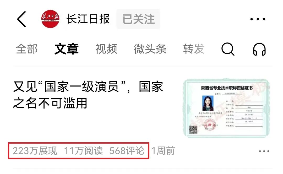 2月9日,长江日报大武汉客户端刊发的《又见“国家一级演员”,国家之名不可滥用》一文引发广泛社会关注。
