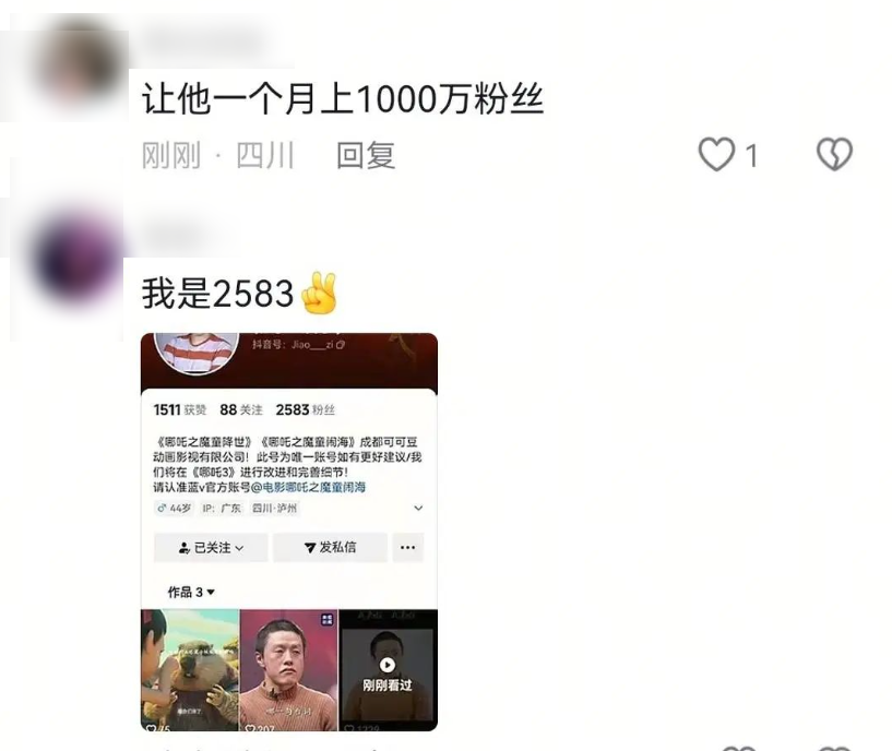不少误以为真的网友,在相关账号下留言,对电影提意见、询问影片细节,呼吁影迷们助力,将账号粉丝量推到1000万。