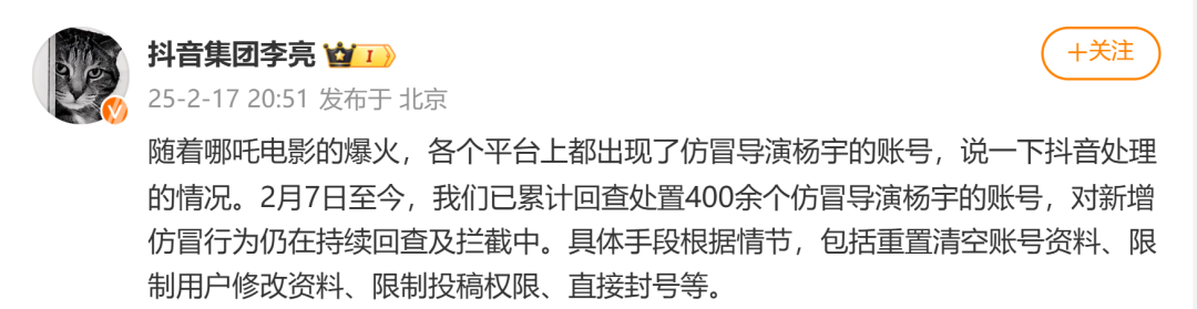 抖音集团副总裁李亮昨晚表示,2月7日至今,抖音已累计回查处置400余个仿冒导演杨宇的账号,对新增仿冒行为仍在持续回查及拦截中。具体手段根据情节,包括重置清空账号资料、限制用户修改资料、限制投稿权限、直接封号等。