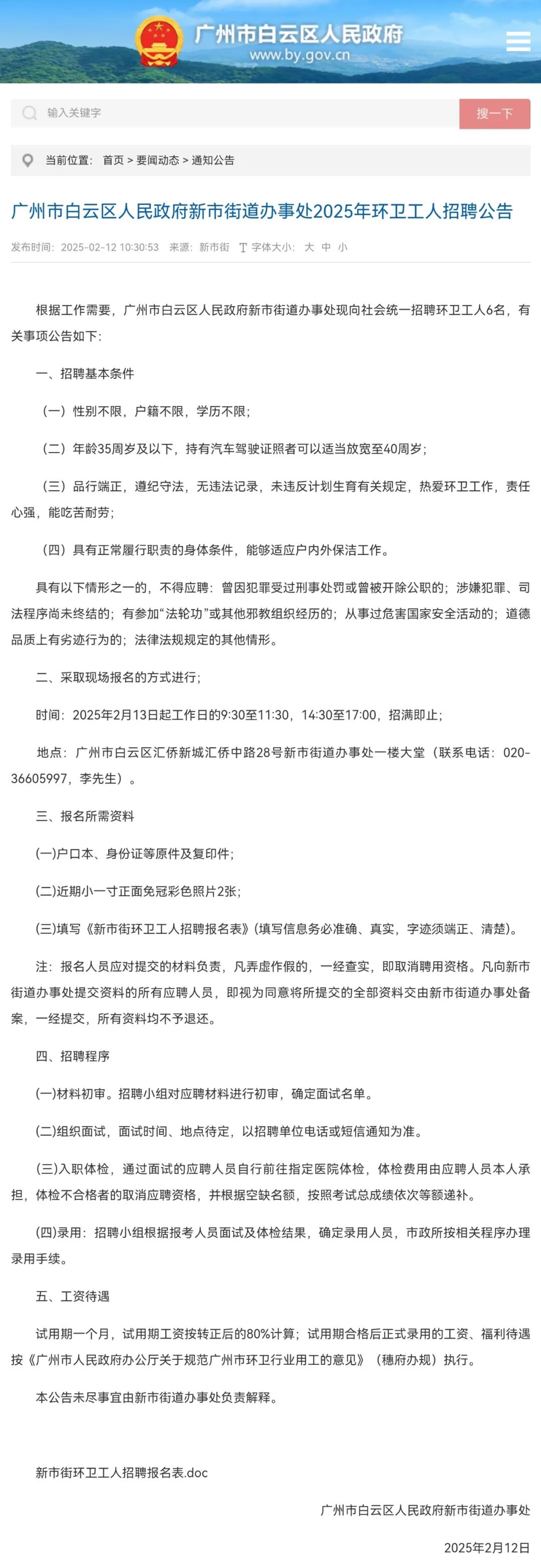 有网友在社交平台发文称,“卷翻天,街道办招环卫工只招90后”。经调查,2月12日广州市白云区人民政府官网上发布了这条招聘公告。公告称:新市街道办事处现向社会统一招聘环卫工人6名,性别不限,户籍不限,学历不限,年龄35周岁以下,持有汽车驾驶证照者可以适当放宽至40周岁。