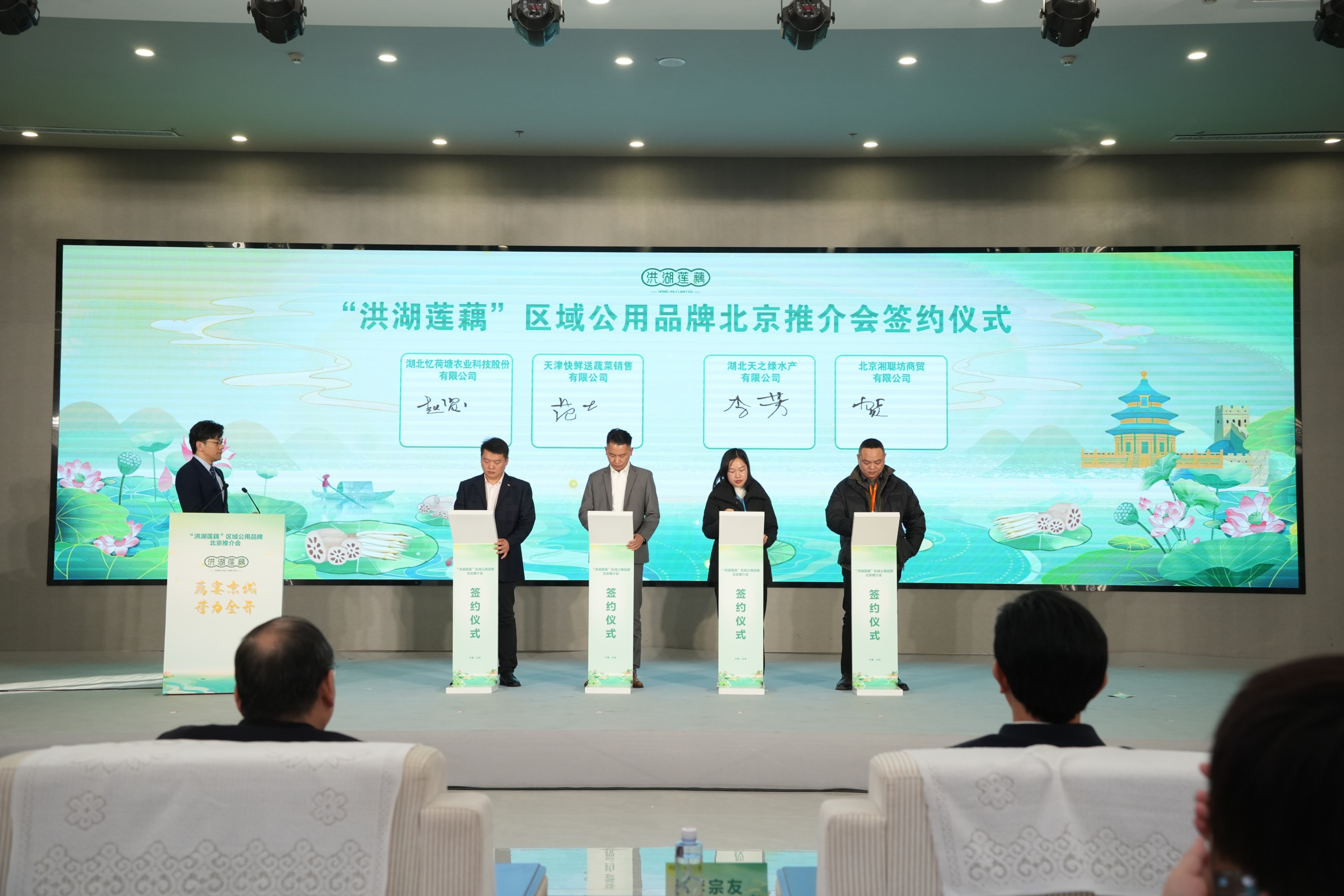 在与会嘉宾见证下,湖北华贵集团、洪湖市莲承生态农业、湖北忆荷塘农业、湖北天之绿水产等洪湖莲藕企业与北京立荣盛有限公司、北京江华龙飞农副产品有限公司、天津快鲜送蔬菜销售有限公司、北京湘聪坊商贸等京津冀地区渠道商现场签订意向采购协议,更多订单还在进一步洽谈中。