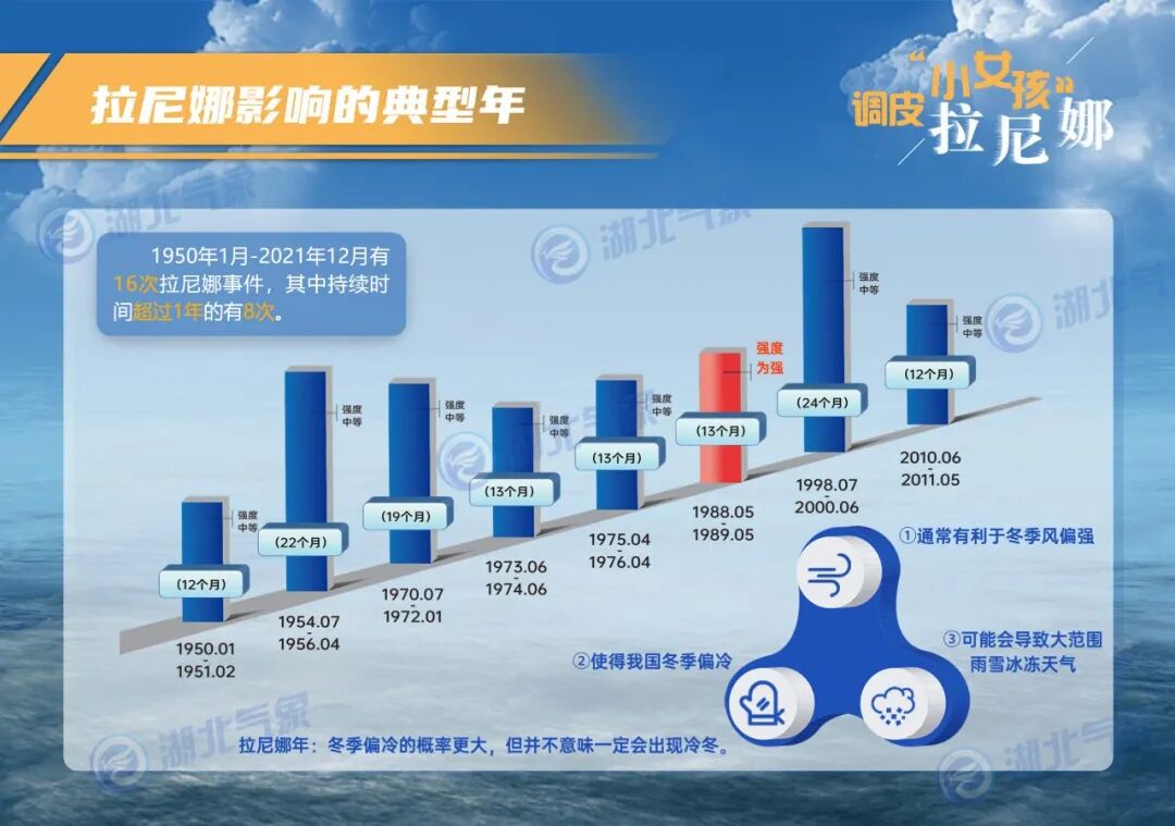 从气温方面来看,拉尼娜的到来,通常有利于冬季风偏强,使得我国冬季偏冷,可能会导致大范围的雨雪冰冻天气。因此在人们印象中,拉尼娜总是跟“冷冬”、“极端寒冬”、“超级寒潮”等关键词绑定在一起,不过拉尼娜带来的影响复杂且并非一成不变。虽然拉尼娜年冬季偏冷的概率更大,但并不意味着一定会出现冷冬。1951年以来的15次拉尼娜事件中,有10次我国冬季气温偏低,像2008年南方遭遇的罕见低温雨雪冰冻灾害就是典型案例。不过在全球变暖越发明显的大趋势下,近年来也数次出现拉尼娜年冬天偏暖的情况。