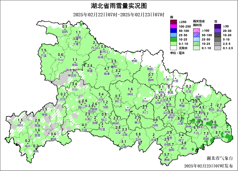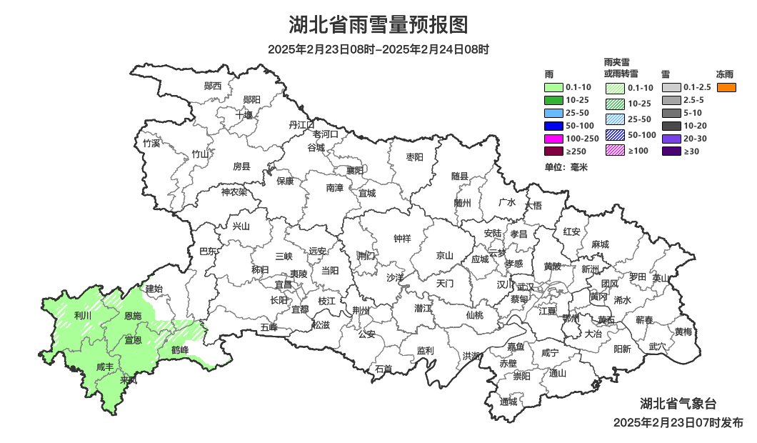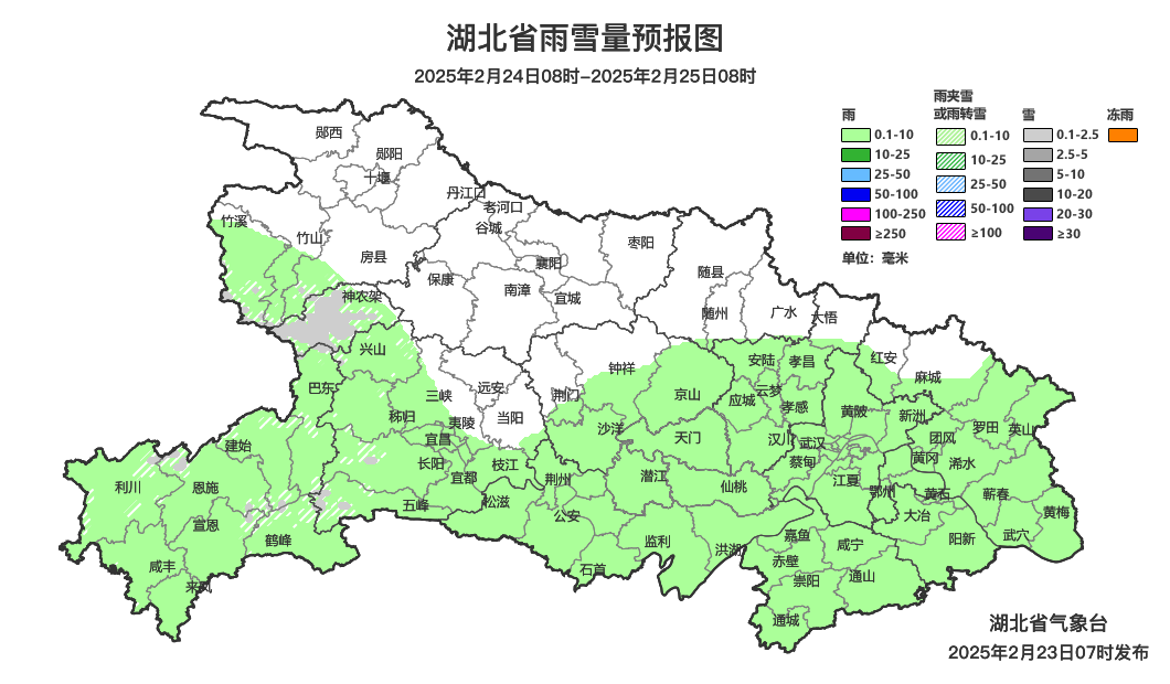 2月24日08时-25日08时,鄂西北南部、鄂西南阴天有小雨,高山地区有雨夹雪或雪;其他地区多云到阴天,晚上江汉平原、鄂东北南部、鄂东南有短时小雨。最高气温西部6~8℃、东部8~12℃,最低气温1~5℃,偏北风2到3级。