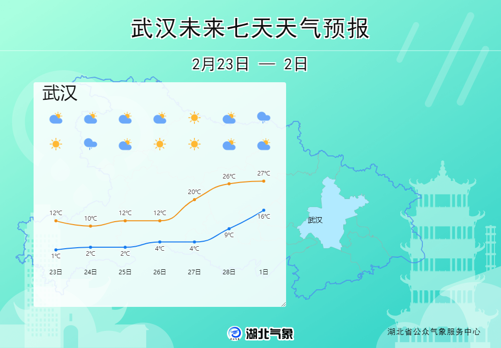 2月25日08时-26日08时,湖北全省阴天到多云,其中咸宁局地有短时小雨。最高气温中西部12~18℃、东部9~12℃,最低气温1~6℃,偏南风2到3级。