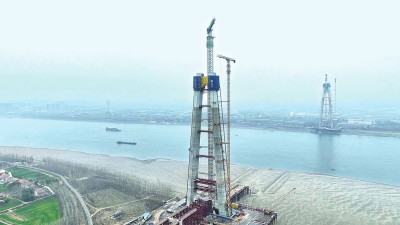 江汉风报道:连日来,位于江陵县的观音寺长江大桥北岸项目全面按下建设“加速键”,建设者们铆足干劲抓进度、忙生产,加紧进行钢壳—混凝土塔柱施工,让主塔节节攀高。
