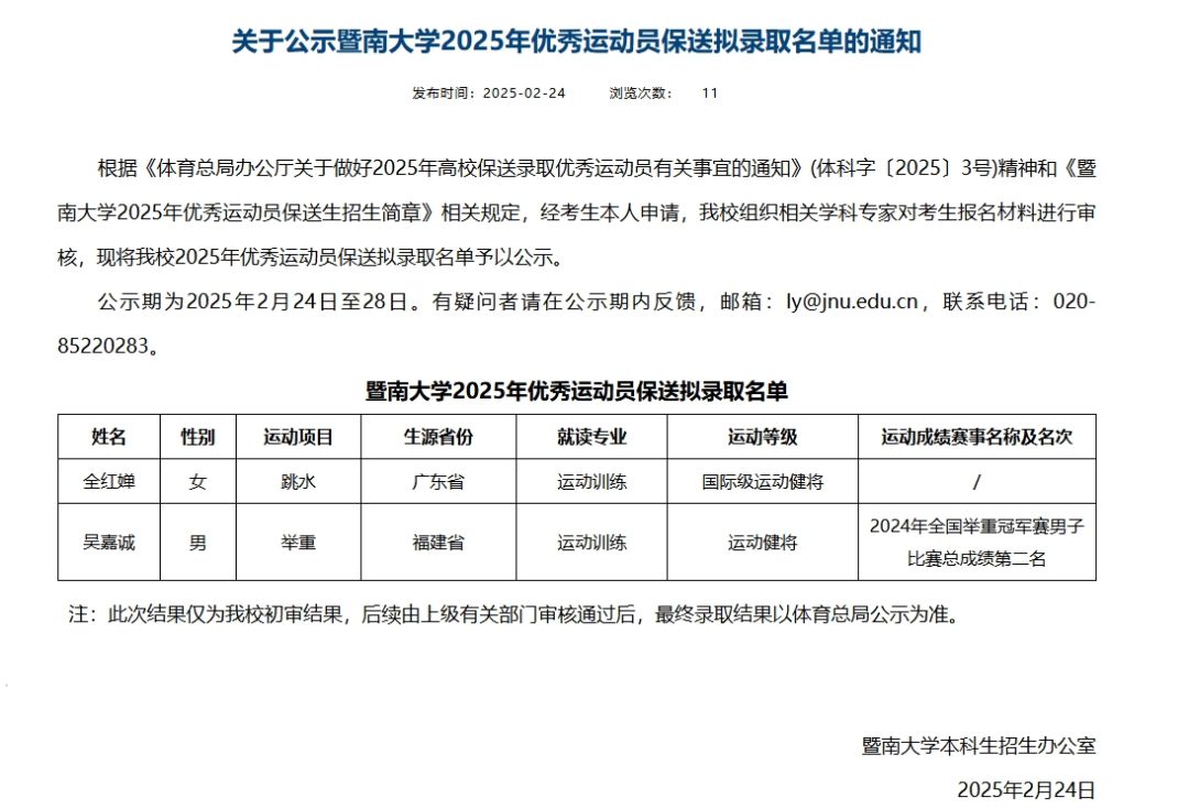 根据《体育总局办公厅关于做好2025年高校保送录取优秀运动员有关事宜的通知》(体科字〔2025〕3号)精神和《暨南大学2025年优秀运动员保送生招生简章》相关规定,经考生本人申请,暨南大学组织相关学科专家对考生报名材料进行审核,现将学校2025年优秀运动员保送拟录取名单予以公示。